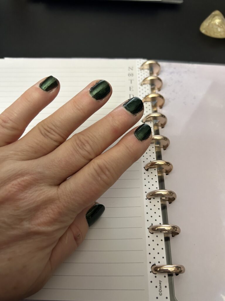 I had been down and out last week with a terrible sinus infection, so I thought painting my nails would perk me up. I went into my nail polish stash and thought about what color I wanted to wear. I chose a deep, dark, shiny green.